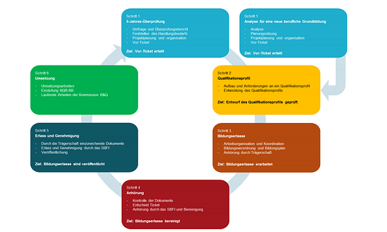 Die beruflichen Grundbildungen werden aufgrund der Bedürfnisse der Arbeitswelt entwickelt und periodisch auf wirtschaftliche, technologische, ökologische und didaktische Entwicklungen hin überprüft und gegebenenfalls angepasst. Der Prozess der Berufsentwicklung orientiert sich an den Bedürfnissen der Verbundpartner und ist in die Schritte Analyse, Qualifikationsprofil, Bildungserlasse, Anhörung, Erlass und Genehmigung und Umsetzung gegliedert.