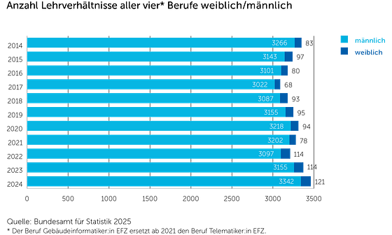 2024 sind 3‘463 Lernende in eine der vier beruflichen Grundbildungen der Elektrobranche eingetreten. Davon waren 121 resp. 3.5% Frauen.