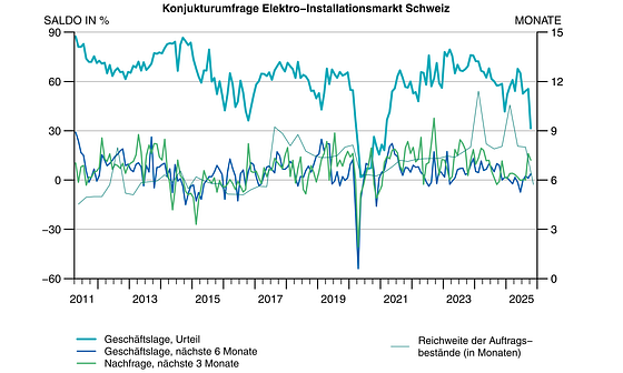 Die Konjunkturforschungsstelle der ETH Zürich (KOF) befragt jedes Quartal rund 70 Elektro-Installationsfirmen zu ihrer aktuellen Geschäftslage und dem erwarteten Auftragseingang.
