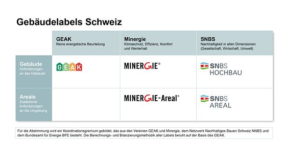 Der Gebäudeenergieausweis der Kantone GEAK, Minergie, der Standard Nachhaltiges Bauen Schweiz SNBS Hochbau des Netzwerks Nachhaltiges Bauen Schweiz (NNBS) und die 2000-Watt-Areale sind eigenständige Label. Sie werden vom Bund und den Kantonen respektive der Wirtschaft getragen. GEAK, Minergie und NNBS sind als Vereine organisiert. Das Label 2000-Watt-Areal ist ein Projekt von EnergieSchweiz, einem Programm des Bundesamts für Energie (BFE). Das oberste Ziel dieser Label ist es, einen Beitrag zu den Zielen der Energie- und Klimapolitik der Schweiz sowie der Strategie Nachhaltige Entwicklung zu leisten.
