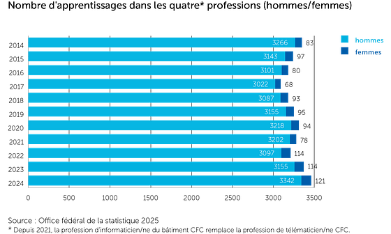 En 2024, 3463 apprentis ont commencé l'une des quatre formations de base dans a branche électrique. Parmi eux, 121 ou 3.5% étaient des femmes.