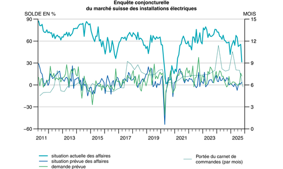 Le service de recherche conjoncturelle de l’EPF Zurich (KOF) interroge chaque trimestre quelque 70 entreprises d’installations électriques sur leur marche des affaires actuelle et sur les entrées de commandes attendues.