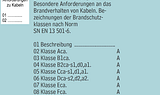 Les classes principales et les classes supplémentaires décrivent la réaction au feu d’un câble. La classe principale énonce la performance de la résistance au feu d’un câble, p.ex. l’annotation Cca correspond à «pas de propagation de la flamme sous l’effet thermique». Les classes supplémentaires clarifient à l’aide des lettres s, d et a, les critères quant à la production de fumée, à la formation de gouttelettes et la corrosivité.