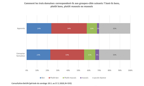 La majorité des participants à la consultation trouve également que les domaines sont bien (24% et 23%) ou plutôt bien (34% et 33%) adaptés aux apprentis et aux entreprises formatrices.