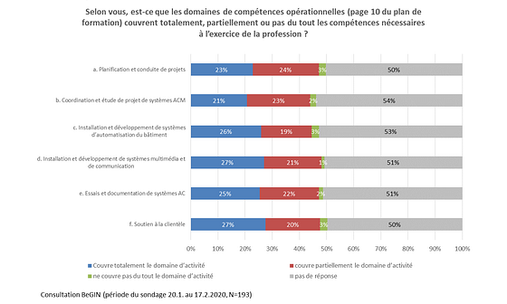 Les participants à la consultation ont eu des difficultés à évaluer les compétences opérationnelles. Plus de 50% des participants n’ont pas répondu à ces questions. Pour les autres participants, la majorité des compétences opérationnelles sont couvertes totalement (valeurs entre 21% et 27%) ou partiellement (valeurs entre 19% et 24%). Seule une minorité est d’avis que les compétences opérationnelles requises ne sont pas couvertes.