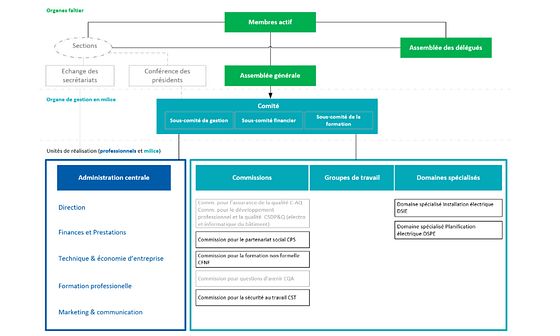 La gestion des affaires de l’association est assurée par le Comité, les sous-comités et l’administration centrale. Des commissions, des groupes de travail et des domaines spécialisés soutiennent les organes de direction dans la perception et l’exécution des affaires de l’association. L’échange et la collaboration avec les 18 sections se font par le biais de la conférence des présidents et l’échange avec les secrétariats.