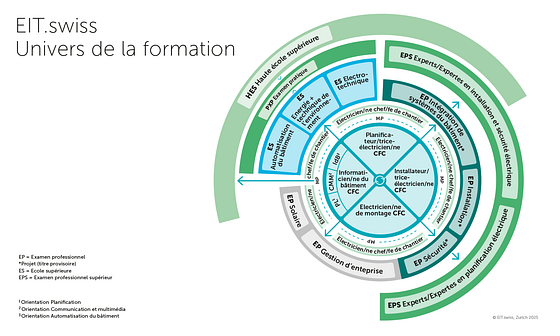 EIT.swiss a introduit un nouveau système de formation professionnelle en 2017 qui a été élaboré en collaboration avec l’Inspection fédérale des installations à courant fort (ESTI), l’Association Suisse pour le Contrôle des Installations électriques (ASCE), l’Union Suisse des Sociétés d’Ingénieurs‑Conseils (USIC), l’Initiative réseau bâtiment (IRB), l’Association suisse et liechtensteinoise de la technique du bâtiment (suissetec) et la Communauté d’Intérêts pour la formation continue dans la branche électrique (IG-Elektro). Ce nouveau système repose sur les règlements existants et comporte trois examens professionnels et deux examens professionnels supérieurs.