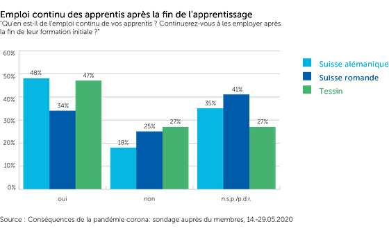 Jusqu’à la fin mai 2020, le licenciement de collaborateurs n’était un thème que pour peu d’entreprises. Il y avait toutefois des incertitudes sur « l’avenir » des apprentis après la formation initiale. Par rapport aux autres questions, un nombre relativement élevé d’entreprises ont choisi l’option « je ne sais pas/pas de réponse ». En Suisse romande, un bon tiers a l’intention de continuer à employer les apprentis. Au Tessin et en Suisse alémanique, ce chiffre se monte à un peu moins de la moitié des entreprises interrogées. Toutefois, seule une minorité d’entreprises ressentent des effets directs sur l’occupation des places d’apprentissage actuelles. La majorité (surtout en Suisse alémanique et romande) estime que la situation est similaire à celle des autres années.
