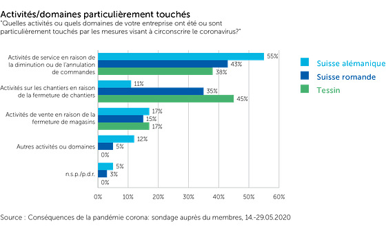 Avant le 15 mars 2020, le niveau des commandes des entreprises était généralement bon à très bon dans toutes les trois régions linguistiques. Durant le confinement, la situation des commandes s’est aggravée. Il n’est pas surprenant que la partie italophone de la Suisse ait été la plus touchée par cette aggravation. Toutefois, la majorité des entreprises de Suisse romande et de Suisse alémanique ont également ressenti une baisse des commandes. Les activités de service, les activités sur les chantiers et les activités dans les magasins de vente ont été affectées par les mesures visant à confiner le coronavirus. Les différences régionales sont également évidentes ici : par ex., en comparaison avec le Tessin et la Suisse romande, il y a eu moins de fermetures de chantiers en Suisse alémanique.