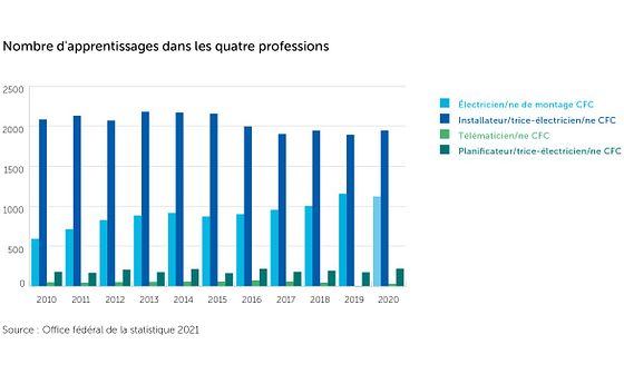 Début mai, l’Office fédéral de la statistique a publié les entrées sur le marché du travail pour 2020. Au total 3‘312 jeunes ont opté pour un apprentissage dans les quatre professions d‘électricien/ne de montage CFC, d’installateur/trice-électricien/ne CFC, de planificateur/trice-électricien/ne CFC et de télématicien/ne CFC. La proportion de femmes dans les apprentissages reste de 3%, ce qui correspond à 94 apprentissages.
