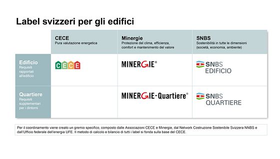 Il Certificato energetico cantonale degli edifici (CECE), Minergie, lo Standard Costruzione Sostenibile Svizzera (SNBS) Edifici della Rete Costruzione Sostenibile Svizzera (NNBS) e le Aree 2000 watt sono label indipendenti, sostenuti dalla Confederazione e dai Cantoni o dall'economia. CECE, Minergie e NNBS sono organizzati come associazioni. Il label Area 2000 watt è un progetto di SvizzeraEnergia, un programma dell'Ufficio federale dell'energia (UFE). L'obiettivo principale di questi label è quello di contribuire al raggiungimento degli obiettivi della politica energetica e climatica della Svizzera e della Strategia per uno sviluppo sostenibile.