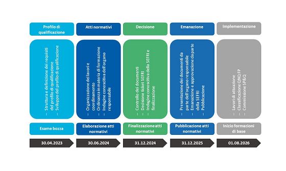 Nell’autunno 2023, le prime bozze dei piani di formazione delle tre formazioni di base saranno finalizzati e sottoposte alla SEFRI per la convalida. La consultazione interna al settore è prevista per fine 2023, inizio 2024.