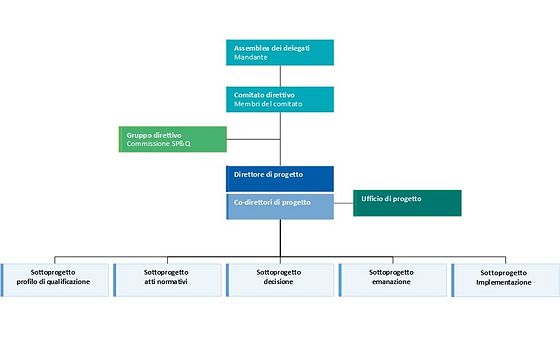 Promotrice del progetto, la commissione per lo sviluppo professionale e la qualità (SP&Q), che ha stabilito, nel corso dell'ultima verifica quinquennale delle formazioni professionali di base, la necessità di apportare modifiche. Su richiesta di detta commissione, il comitato EIT.swiss ha presentato alla Segreteria di Stato per la formazione, la ricerca e l'innovazione (SEFRI) la domanda per il ticket preliminare. Per supportare e legittimare meglio il progetto all'interno del settore, l'organizzazione di progetto è stata ridefinita. Con l'approvazione del mandato di progetto nell'aprile 2022, ai delegati, in qualità di rappresentanti del settore elettrico e delle sezioni, è stato affidato il ruolo di mandante del progetto di revisione. Da parte del comitato, il progetto è monitorato da un comitato direttivo di tre persone (membri della commissione della formazione). Il gruppo direttivo assicura il coordinamento delle esigenze dei partner (associazioni professionali, Confederazione, Cantoni). La direzione di progetto è responsabile della gestione operativa del progetto.