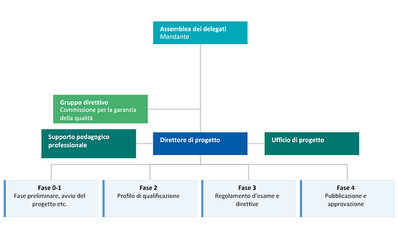 La fase 3 riguarda l’implementazione e la concretizzazione dei risultati della fase 2, in altre parole l’elaborazione del regolamento d’esame e delle direttive. Il regolamento d’esame comprende disposizioni legali, pertanto va approvato dalla SEFRI. Le direttive precisano il regolamento d’esame. I documenti vengono emanati dall’organo responsabile oppure dalla commissione per la garanzia della qualità.